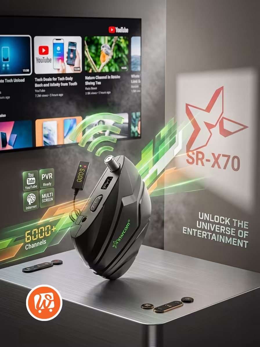 - Wi-Fi ou Ethernet (selon modèle) : Le STARCOM SR-X70 peut prendre en charge une connexion Wi-Fi ou une connexion Ethernet pour accéder à Internet, permettant l’accès à des services en ligne comme YouTube, ou pour profiter de mises à jour en ligne.